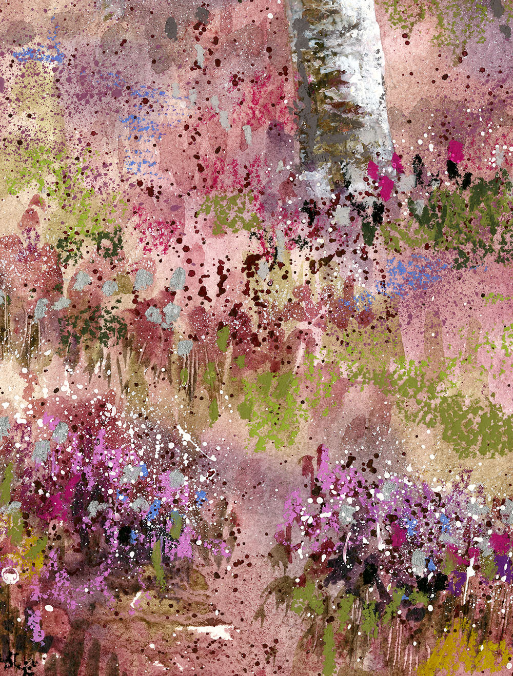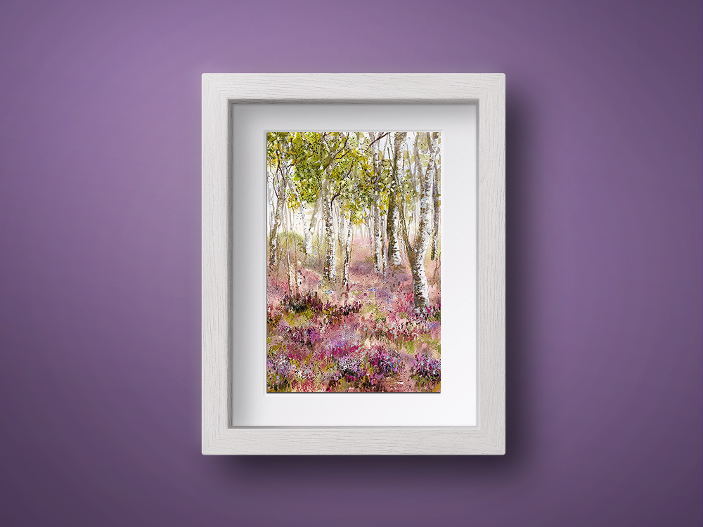 Silver birch and heather on a misty morning